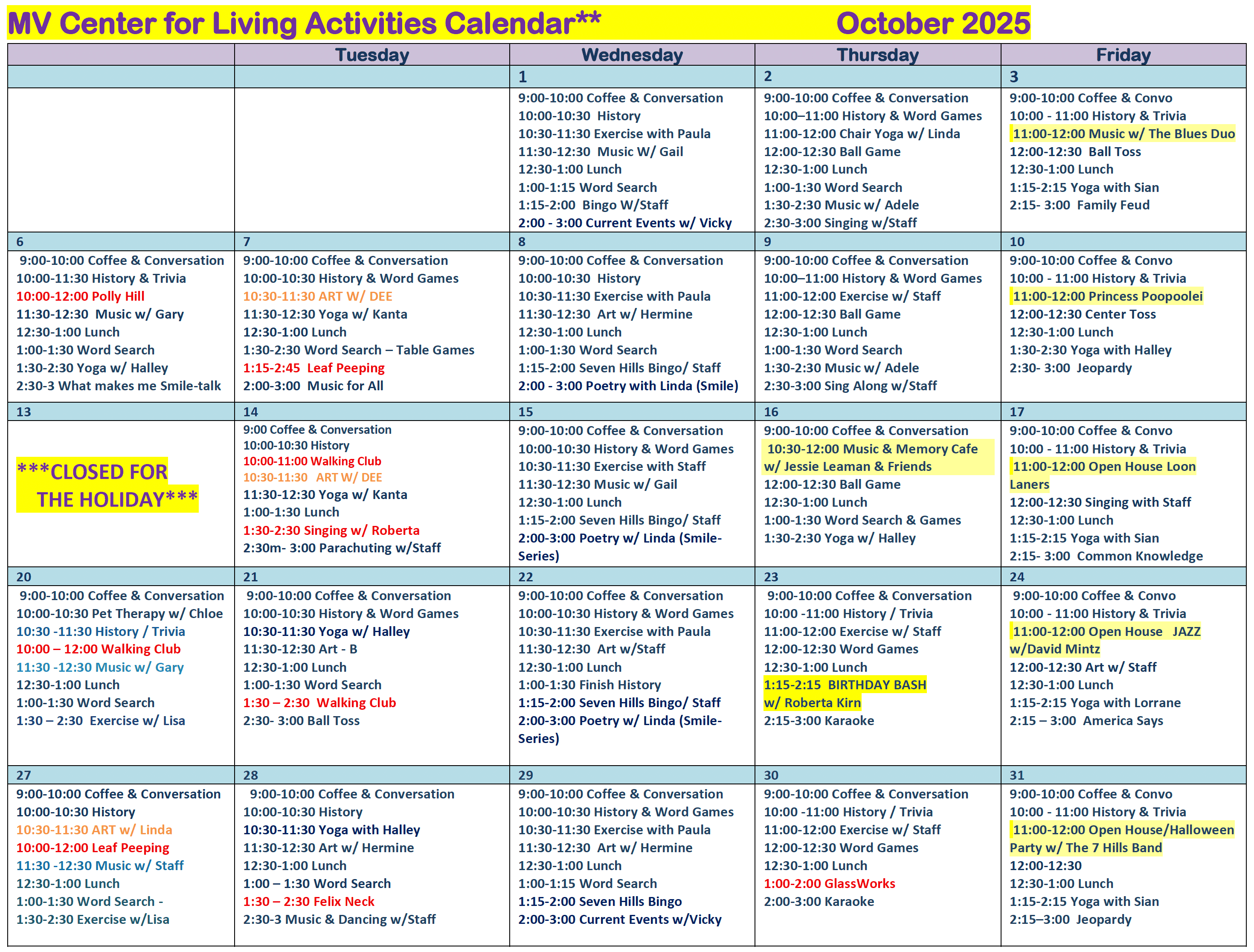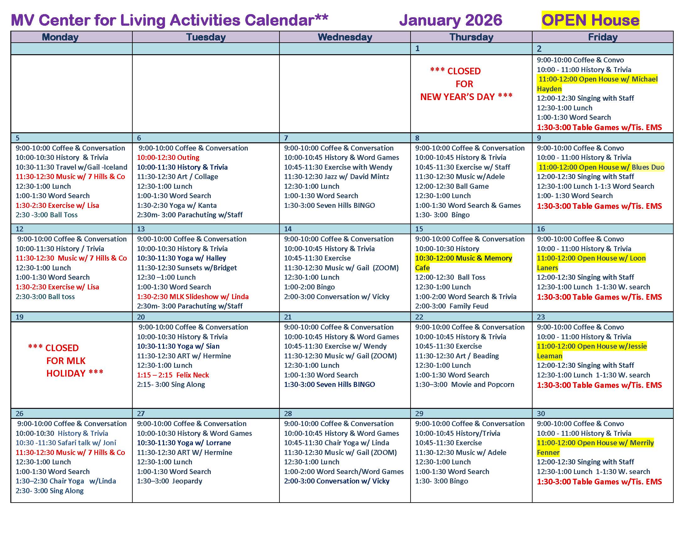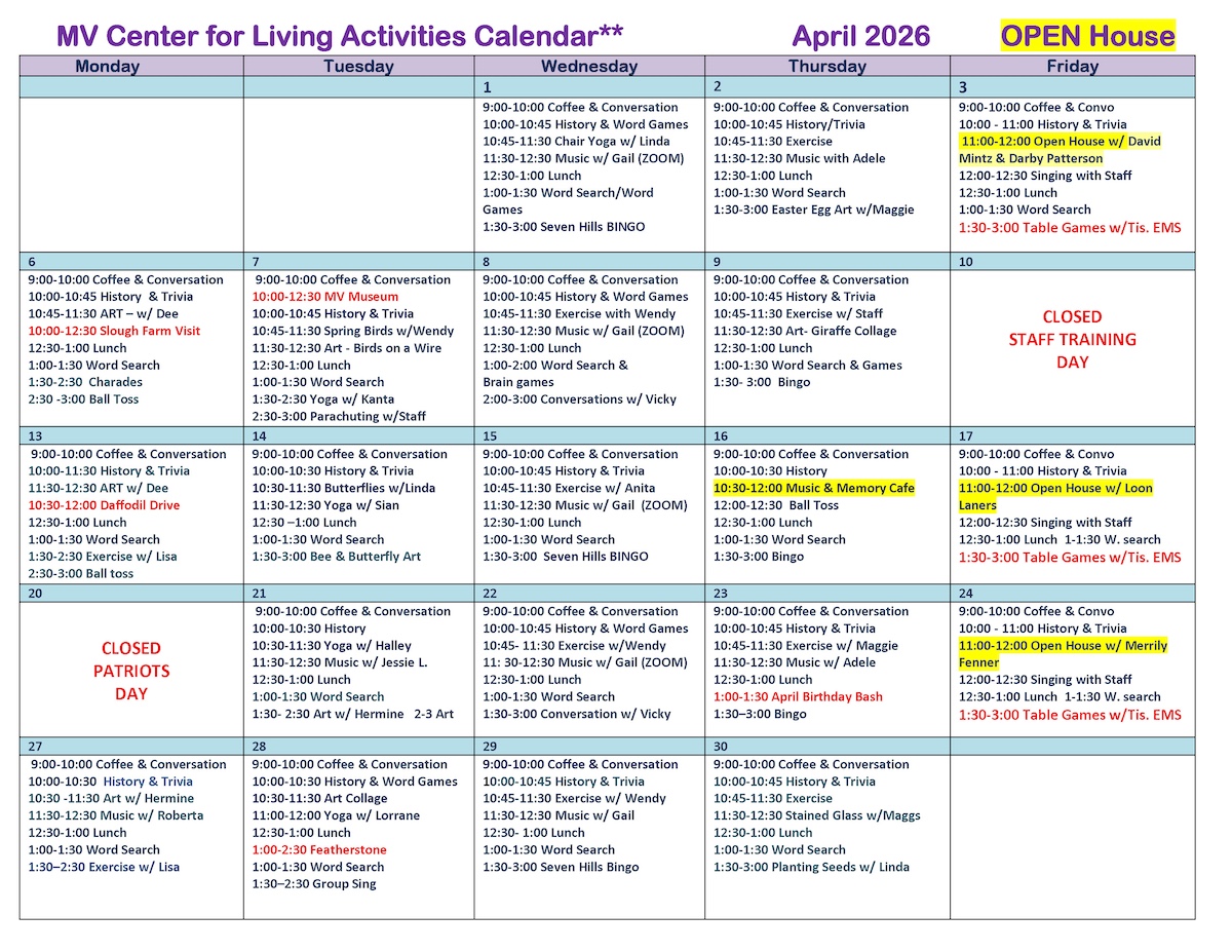 Exercise, arts, music, yoga, drama, discussions, current events, games, special presentations by local artists, companionship and a snack and family-style lunch make up the daily calendar of our Supportive Day Program.